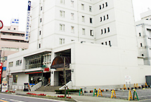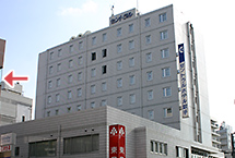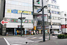 押しボタン式の信号がありますので、渡って右へ向かってください。 - 2分ほど進みますと、左側に白い9階建てのビルがあります。そちらが当ホテルです。入り口は東日本銀行の先にある階段又はエレベーターをご利用ください。